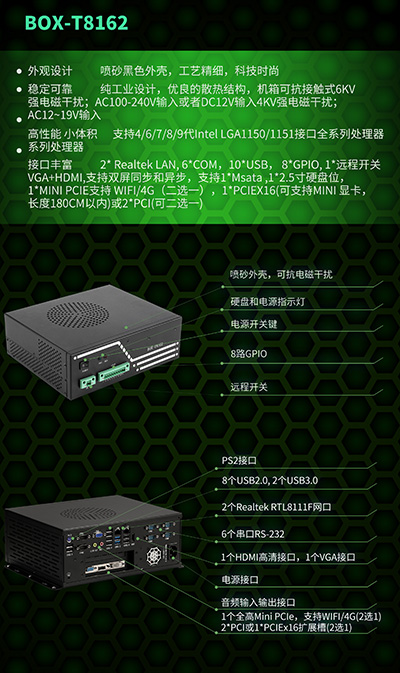 2個Realtek RTL8111F網(wǎng)口(10/100/1000M自適應(yīng)),6個串口RS-232 (RS485需加模塊),8個USB2.0, 2個USB3.0,方便ODM定制,保證客戶現(xiàn)場復(fù)雜的應(yīng)用需求;HDMI、VGA雙顯示接口,1路音頻輸入輸出;8路數(shù)字開關(guān)量GPIO(4*GPI,4*GPO,可自定義),1個遠(yuǎn)程開關(guān),1*mSATA,1*SATA 2.5"SSD用于存儲;1個全高M(jìn)ini PCIe,支持WIFI/4G(可二選一),2*PCI或1*PCIEx16擴(kuò)展槽(二選一), 用于集成各種附加卡,例如I/O卡,運(yùn)動控制卡、視覺卡和GPU卡(可支持長度180CM的獨(dú)立顯卡)。能滿足不同市場的多樣化需求,可廣泛應(yīng)用于工業(yè)制造、自動化檢測、工業(yè)視覺檢測、智能交通等領(lǐng)域。