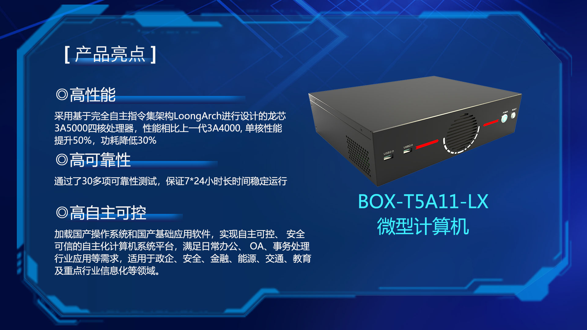 研恒(特控)BOX-T5A11-LX微型計算機采用基于完全自主指令集架構LoongArch進行設計的龍芯3A5000四核處理器,性能相比上一代3A4000, 單核性能提升50%,功耗降低30%,指令集系統(tǒng)架構承載的軟件生態(tài)走向完全自主。整機采用純工業(yè)設計,通過了30多項可靠性測試,保證設備7*24小時長時間穩(wěn)定運行。配套國產BIOS,加載國產操作系統(tǒng)和國產基礎應用軟件,實現(xiàn)自主可控、 安全可信的自主化計算機系統(tǒng)平臺,滿足日常辦公、 OA、事務處理,行業(yè)應用等需求,適用于政企、安全、金融、能源、交通、教育及重點行業(yè)信息化等領域。