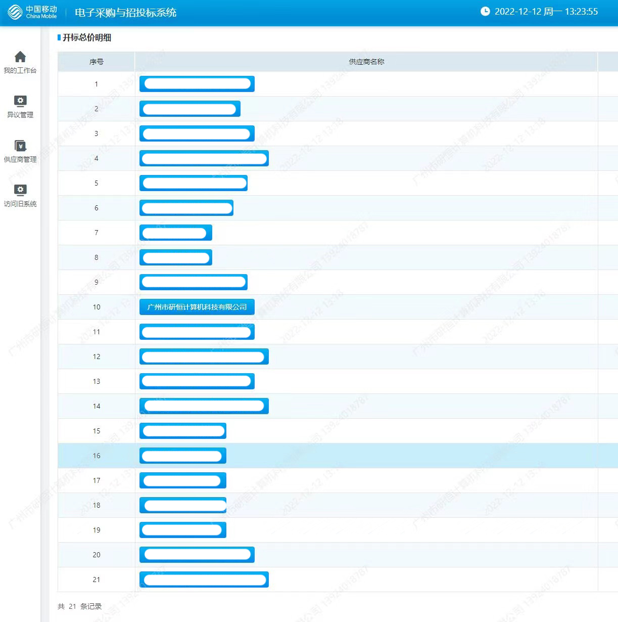 近日,廣州市研恒計算機科技有限公司(以下簡稱“廣州研恒”)在中國移動2022年至2023年桌面筆記本電腦及臺式機電腦產(chǎn)品集中采購項目投標(biāo)過程中獲得報價第一名。